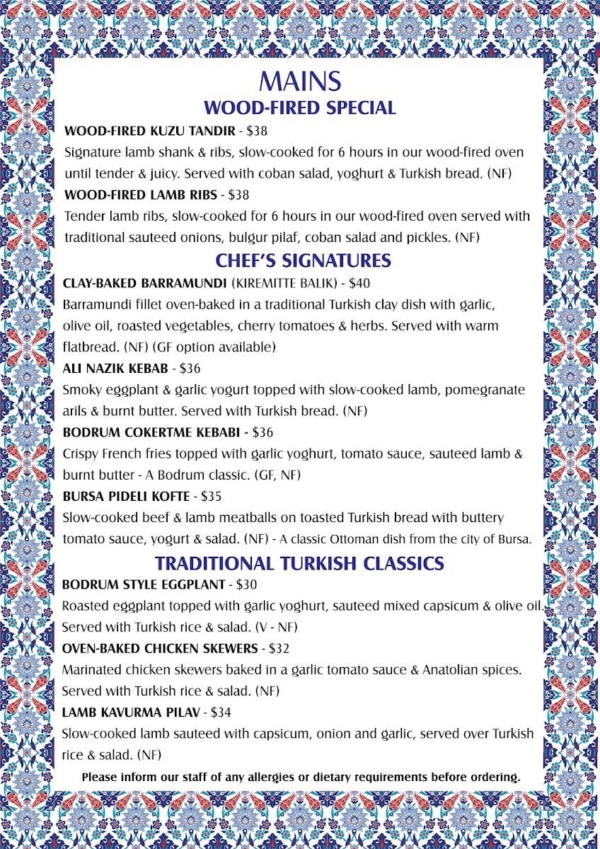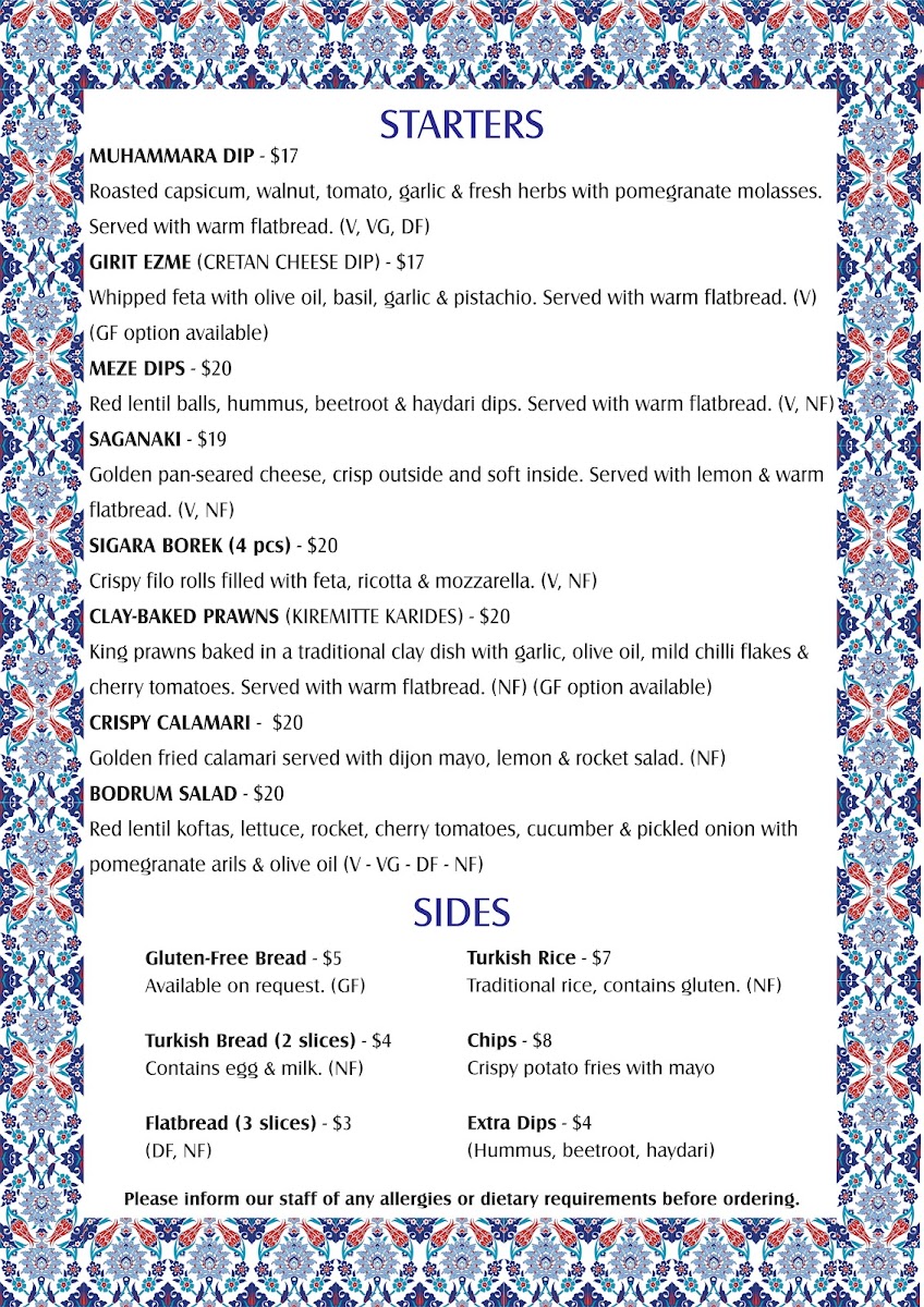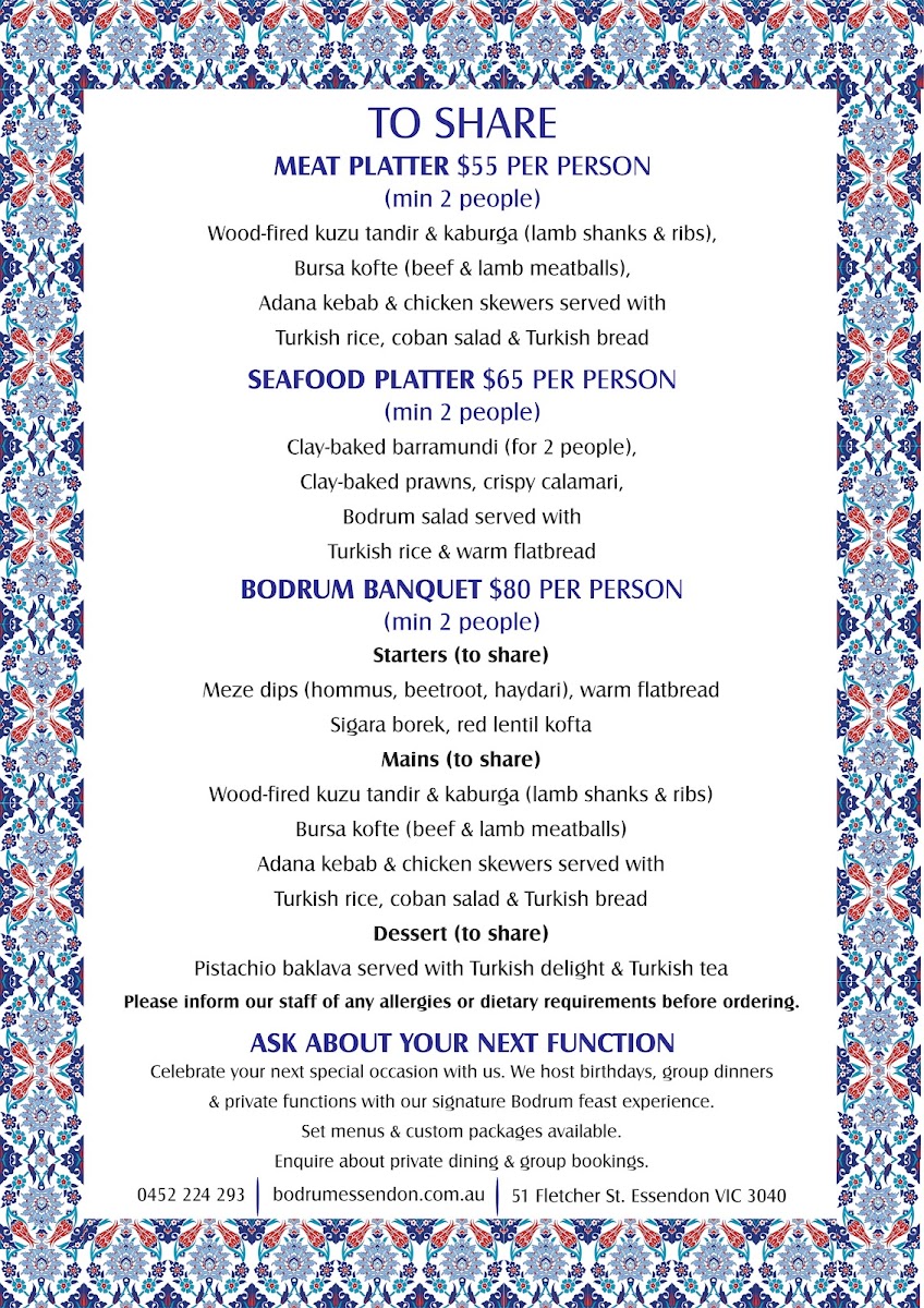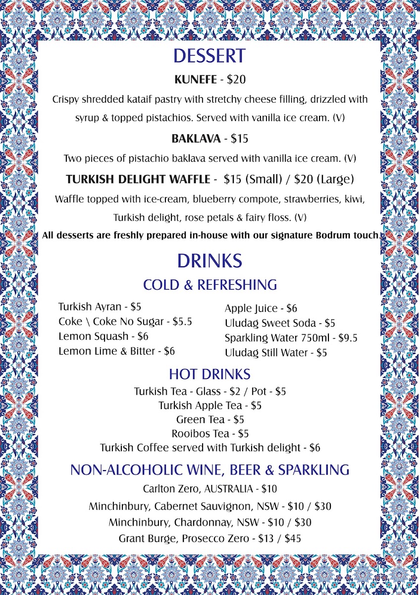 Bodrum Essendon offers a diverse and exciting menu that combines traditional Turkish flavors with modern twists. Starting with the Starters, the Baba Ganoush and Saganaki stand out as excellent choices for anyone looking to begin their meal with rich, savory notes. If you're in the mood for something a little more flavorful, the Sigara Borek and Prawn Skewers are also fantastic options, bringing a touch of crispness and seafood goodness to the table. For those craving variety, the Meze plate provides a perfect sampling of multiple dishes.