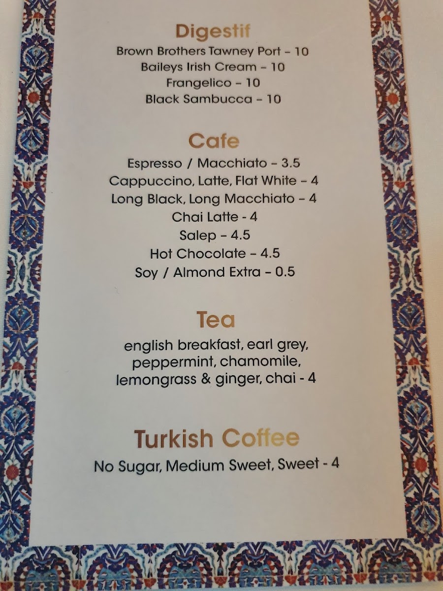 Refreshing beverages are also available, including the traditional Turkish Ayran, various soft drinks like Coke, Lemon Lime & Bitter, and Apple Juice, as well as soothing Turkish Tea or Turkish Apple Tea. If you're looking for something stronger, there's a great selection of Raki, with brands like Tekirdag Gold and Yeni Raki available, alongside a variety of wines and cocktails such as Mimosa and Aperol Spritz.